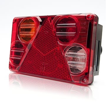 Halogen baklampa för trailer (vänster) med fem funktioner: bakljus, bromsljus, blinkers, backljus och bakdimljus.