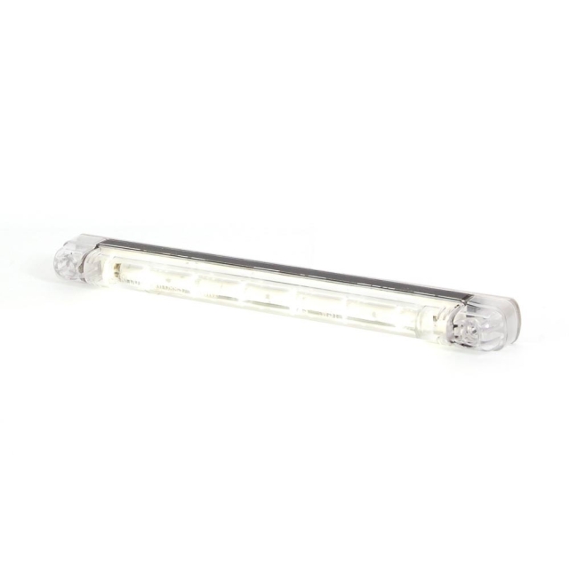 Avlångt, slimmat DRL/positionsljus med LED, klart glas, rundade kanter och lättmonterad design.
