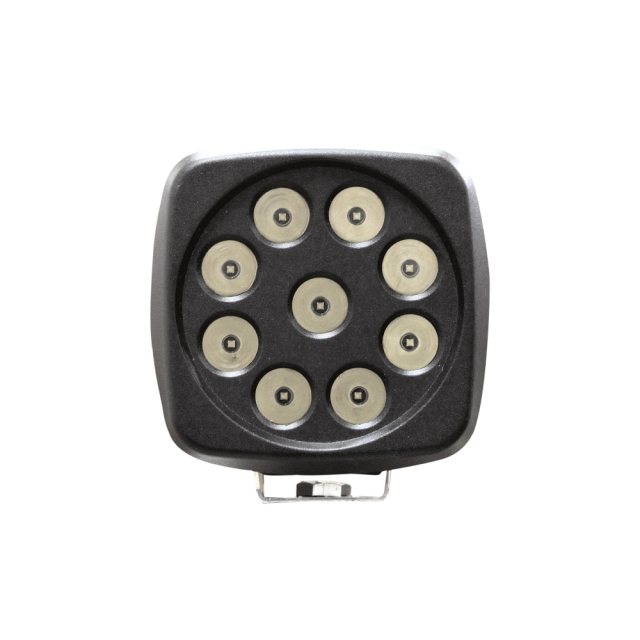 Kvadratiskt 27W arbetsljus med 9 LED, kompakt och robust design, perfekt för tuffa förhållanden. Levereras med kabel och DT-kontakt.
