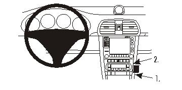 1. Avlägsna skyddsplasten på den dubbelhäftande tejpen på ProClip-fästet. Pressa in fästets vikta högerdel i springan i mittkonsolens sidovägg.