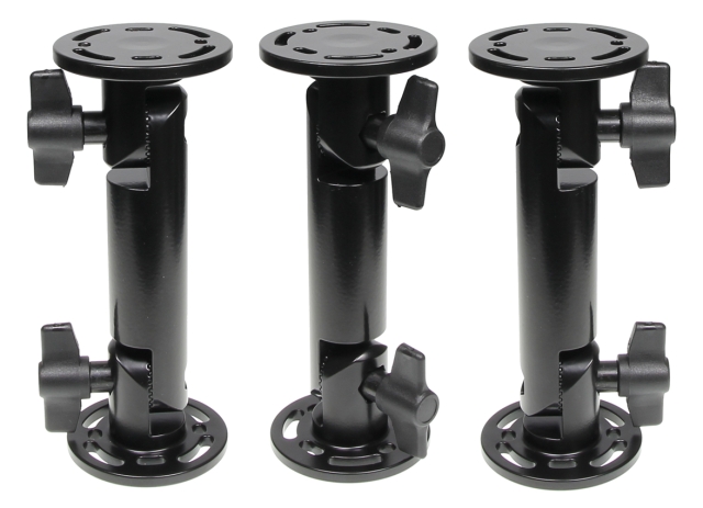 Kan vinklas i sidled i steg om 11,25°, upp till max 180° (16 olika lägen). Den runda monteringsplattan har en diameter på 64 mm och multipla hål för radiell justering. Detta PM-fäste har även en vingmutter i varje tandad led för att man snabbt och enkelt ska kunna ändra vinkeln på inställningen.