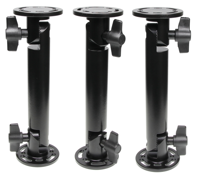 Kan vinklas i sidled i steg om 11,25°, upp till max 180° (16 olika lägen). Den runda monteringsplattan har en diameter på 64 mm och multipla hål för radiell justering. Detta PM-fäste har även en vingmutter i varje tandad led för att man snabbt och enkelt ska kunna ändra vinkeln på inställningen.